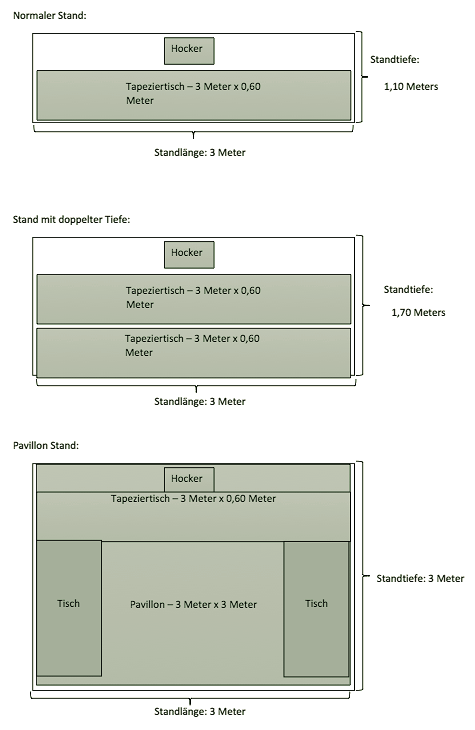 Ebenso stellen wir keine Tische zur Verfügung.Sie buchen bei uns den Standplatz und wir stellen nur die Fläche zur Verfügung.